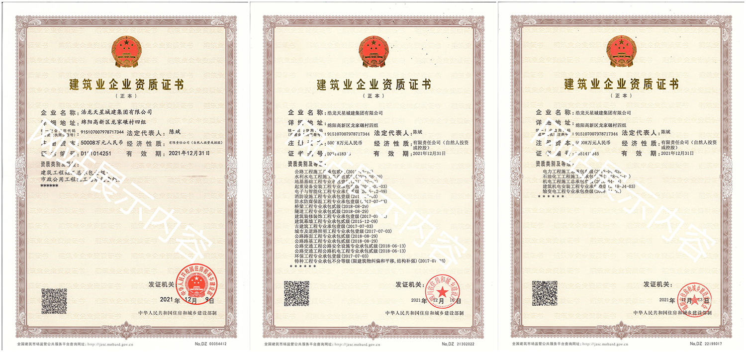 浩龍?zhí)煨浅墙瘓F(tuán)有限公司,2007年成立于“李白故鄉(xiāng)、中國科技城”—四川省綿陽市,企業(yè)注冊資本金5.0008億元。公司共有27項建筑業(yè)企業(yè)資質(zhì),其中國家一級資質(zhì)11項,二級資質(zhì)10項,三級資質(zhì)5項,特種資質(zhì)不分等級1項,類別涵蓋建筑、市政、水利、機(jī)電、隧道、起重設(shè)備安裝等基礎(chǔ)及未來發(fā)展重點(diǎn)專業(yè)。公司下設(shè)三個辦事處,業(yè)務(wù)范圍輻射全國,在建項目三十余個,累計完成產(chǎn)值超11億元。公司是綿陽市建筑施工企業(yè)協(xié)會副會長單位、綿陽遂寧商會會長級單位、綿陽首批建筑業(yè)綠卡企業(yè),在綿陽本地企業(yè)中綜合實(shí)力名列前茅。
